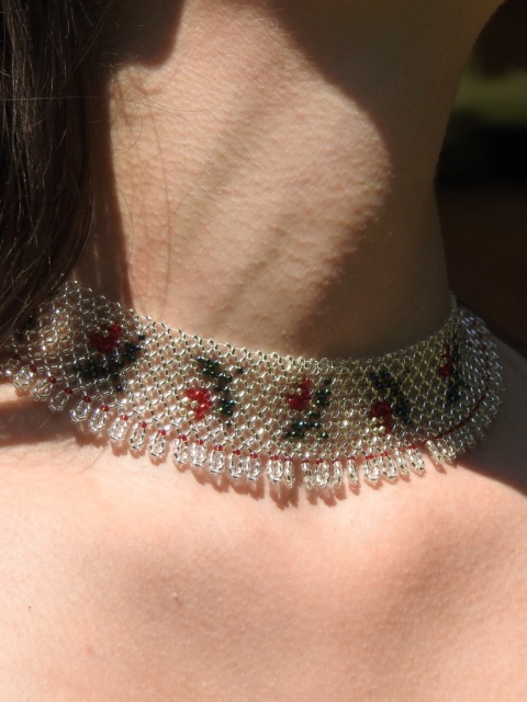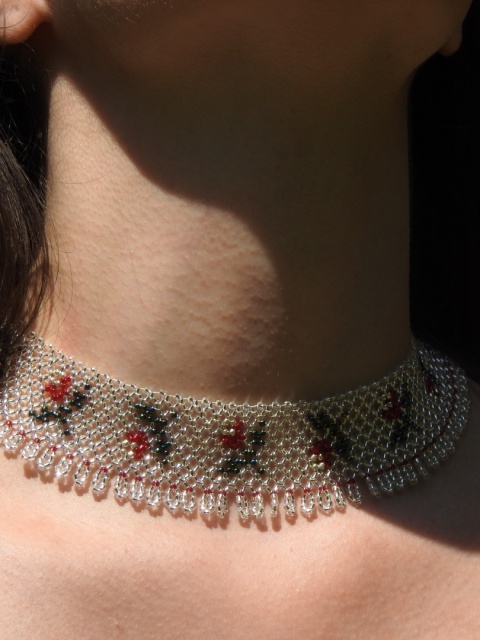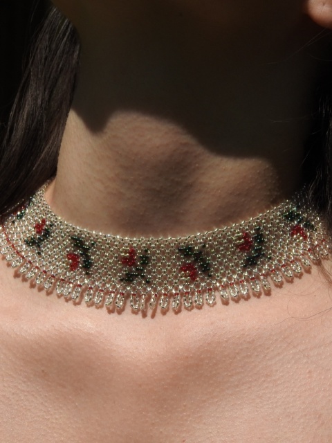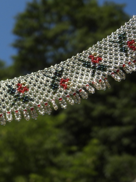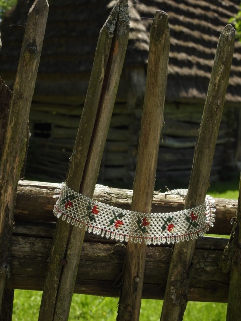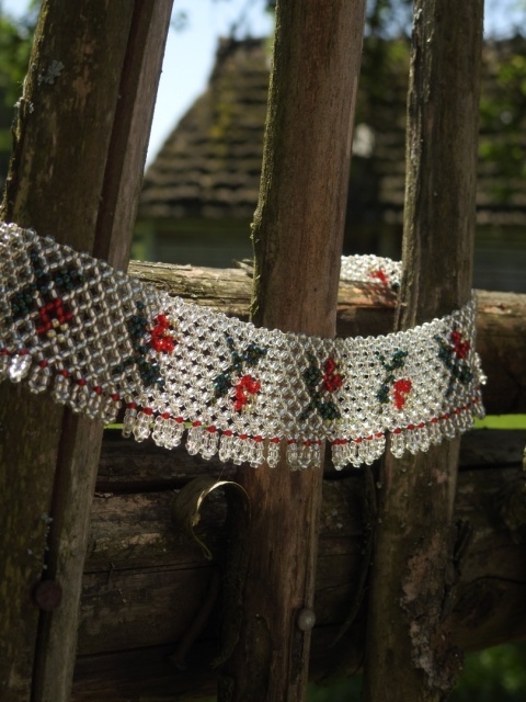 Rekonstrukcja drabynki z 1985 roku z Bojkowszczyzny zachodniej. Oryginalna praca pochodzi z miejscowości Użhorod na Zakarpaciu i jest autorstwa Iryny Kutsyk, ukraińskiej artystki ludowej tworzącej przepiękne prace koralikowe inspirowane wzorami bojkowskimi. Unikalna praca powstała z użyciem setek szklanych koralików.